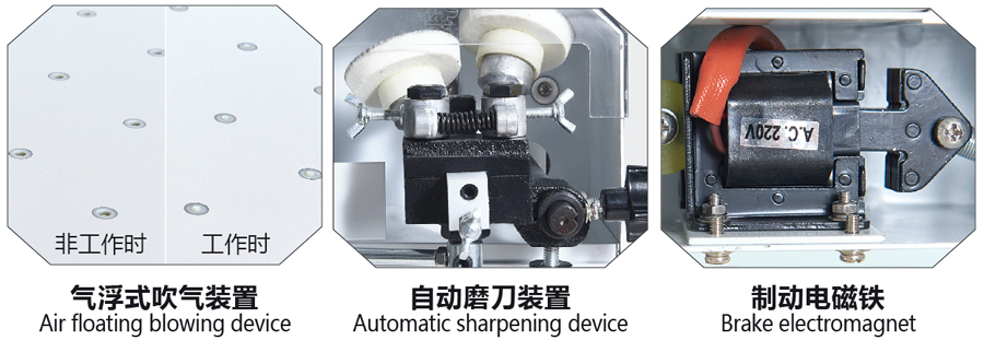 2.本機(jī)器附有特殊氣浮式吹氣裝置,可減小裁片重量與載桌形成的阻力,使裁片易于移動,更精確的裁切小裁剪片。