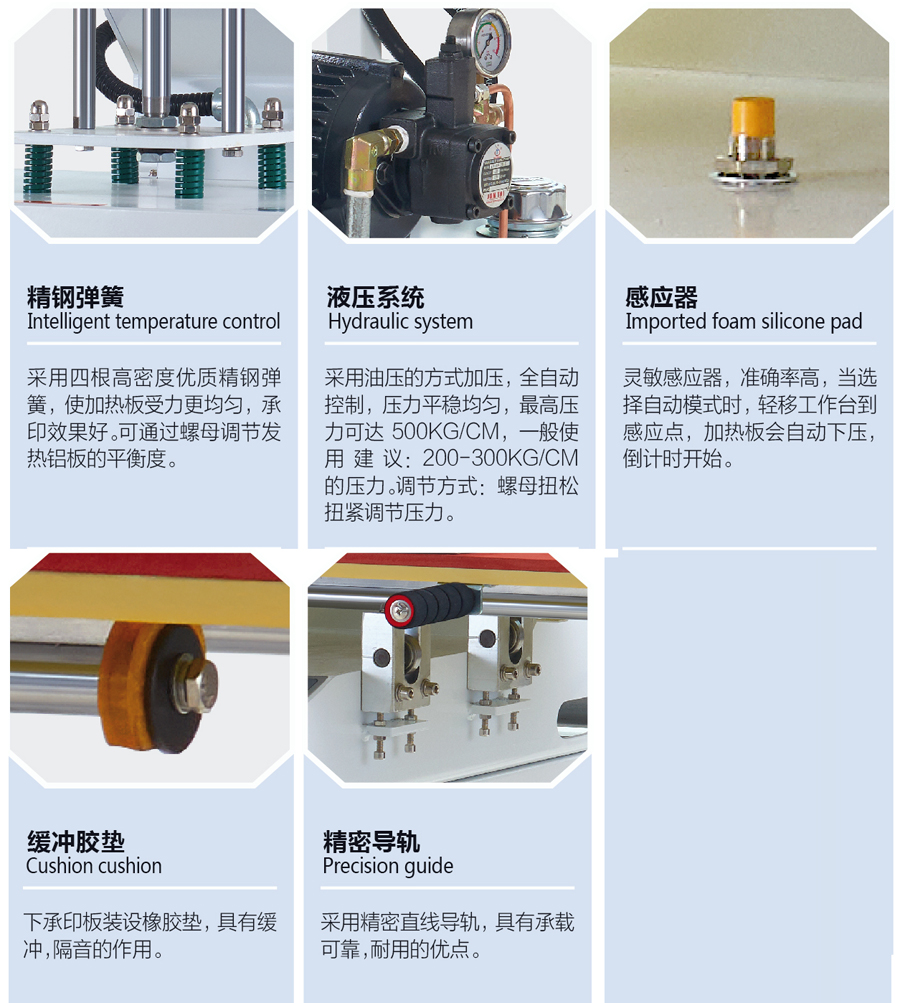 1.本機為液壓式。 2.壓力、溫度、時間等均有刻度顯示,操作方便。 3.上加熱板采用鋁板及鐵氟龍材料,不易污染且利于清潔。 4.本系列燙畫機適用于服裝燙印,個性禮品加工,鼠標墊、拼圖、瓷磚、抱枕、石板畫、熱轉(zhuǎn)印金屬板等熱轉(zhuǎn)印平面產(chǎn)品的燙畫。
